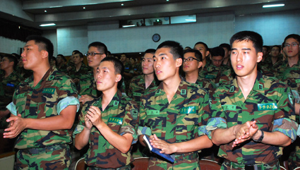 학군장교(ROTC) 군사교육이 이뤄지는 경기도 성남시 창곡동 학생중앙군사학교 멸공관(강당). 예비 장교 500여 명이 시원한 강당에서 생활성가 가수 나정신(체칠리아, 서울 봉천동본당)씨가 부르는 성가를 따라 부르며 흥에 겨워한다.