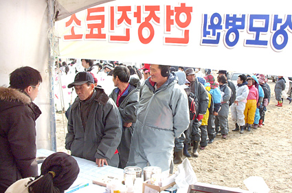 ▲ 의정부성모병원 의료봉사단이 태안에서 1주일간 마련한 현장진료소에서 지역주민과 봉사자들이 길게 줄지어 서 있다.