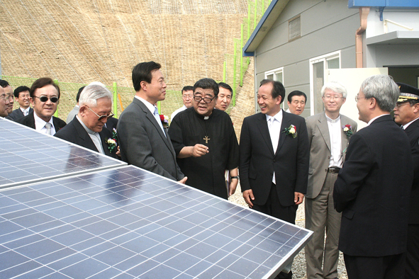 ▲ 서강대학교 이사장 박홍(가운데 신부 등 관계자들이 5월 22일 문경태양광발전소 준공식을 마친 뒤 발전소 시설을 둘러보고 있다. 사진제공=서강대학교 홍보실