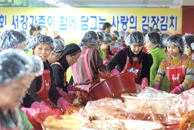 서강대는 18일 교내 곤자가홀 주차장에서 손병두 총장과 교수, 교직원, 학생 200여 명이 참석한 가운데 `제4회 서강가족이 함께 담그는 사랑의 김장김치` 행사(사진)를 열고 김장김치 2000포기를 담가 소년소녀가장ㆍ새터민 학생ㆍ관내 불우 이웃 등 500여 가구에게 전달했다.