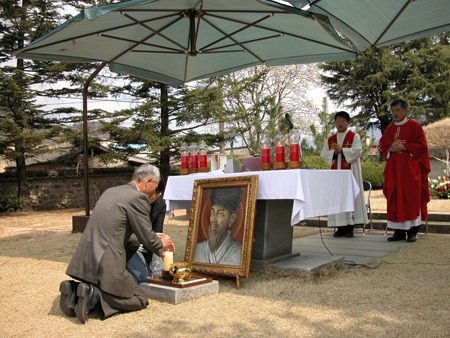 ▲ 수안보본당 연풍공소 이동엽(미카엘) 회장이 성 황석두 루카 성인 수뇩 143주년 기념미사 중 성인 묘역 앞에서 분향하고 있다.