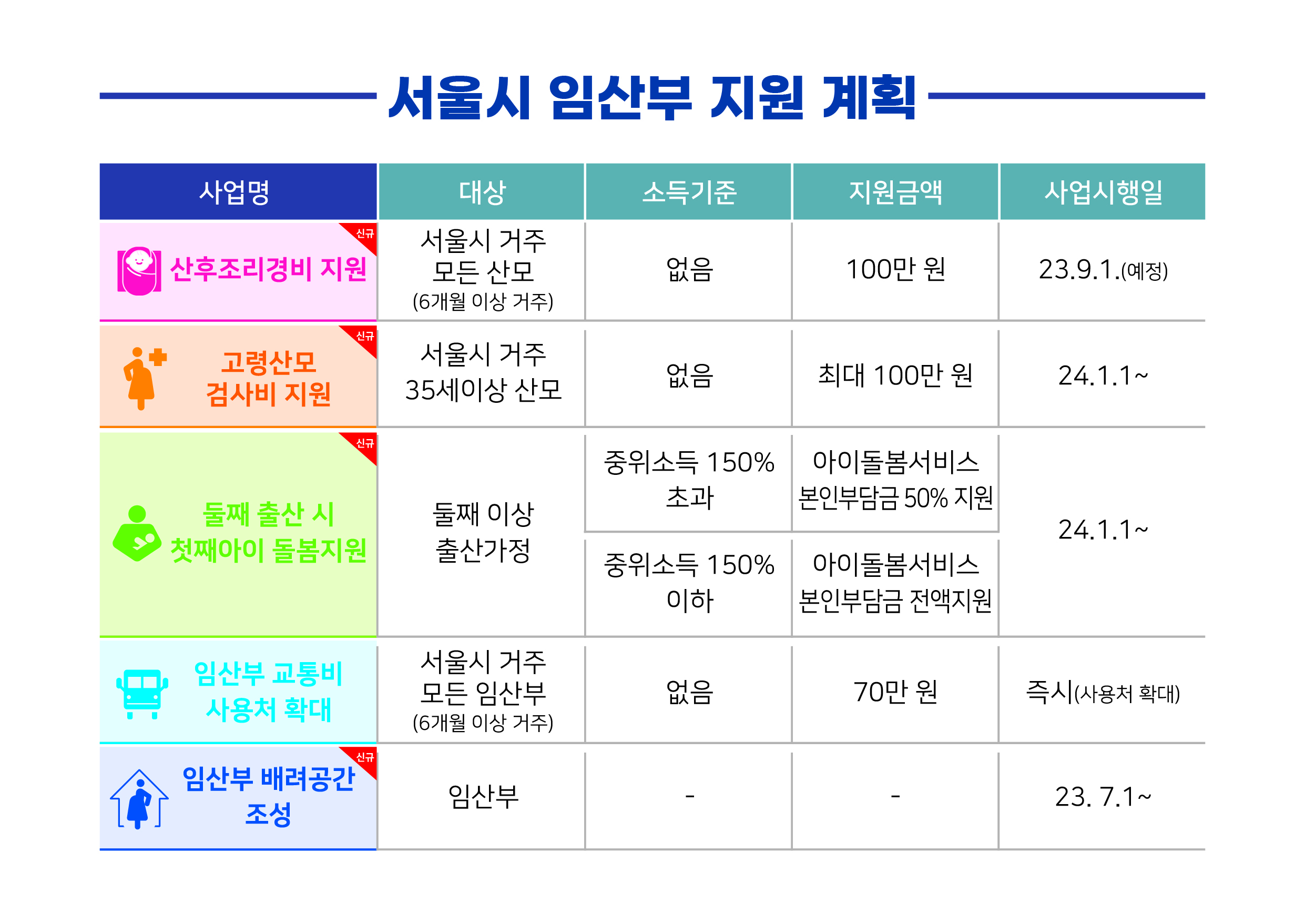 서울시는 이번 대책 가운데 산후조리경비 지원과 임산부교통비 사용처 확대, 임산부 배려공간 조성은 올해부터 본격 시행할 예정입니다.