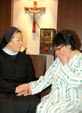 ▲ 국립경찰병원 이미라 원목수녀가 쿠싱증후군을 앓는 강혜숙씨를 위로하고 있다.
