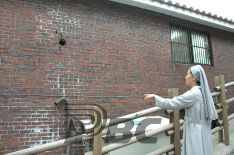 ▲ 이임복 수녀가 하얗게 곰팡이가 낀 요한성인주간보호센터 외벽을 손으로 가리키고 있다.