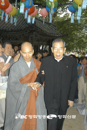 ![]() ▲ 2005년 서울 길상사 창건 8주년 기념 음악회에 참석한 김수환 추기경이 길상사 주지 덕조스님 손을 잡고 입장하고 있다.