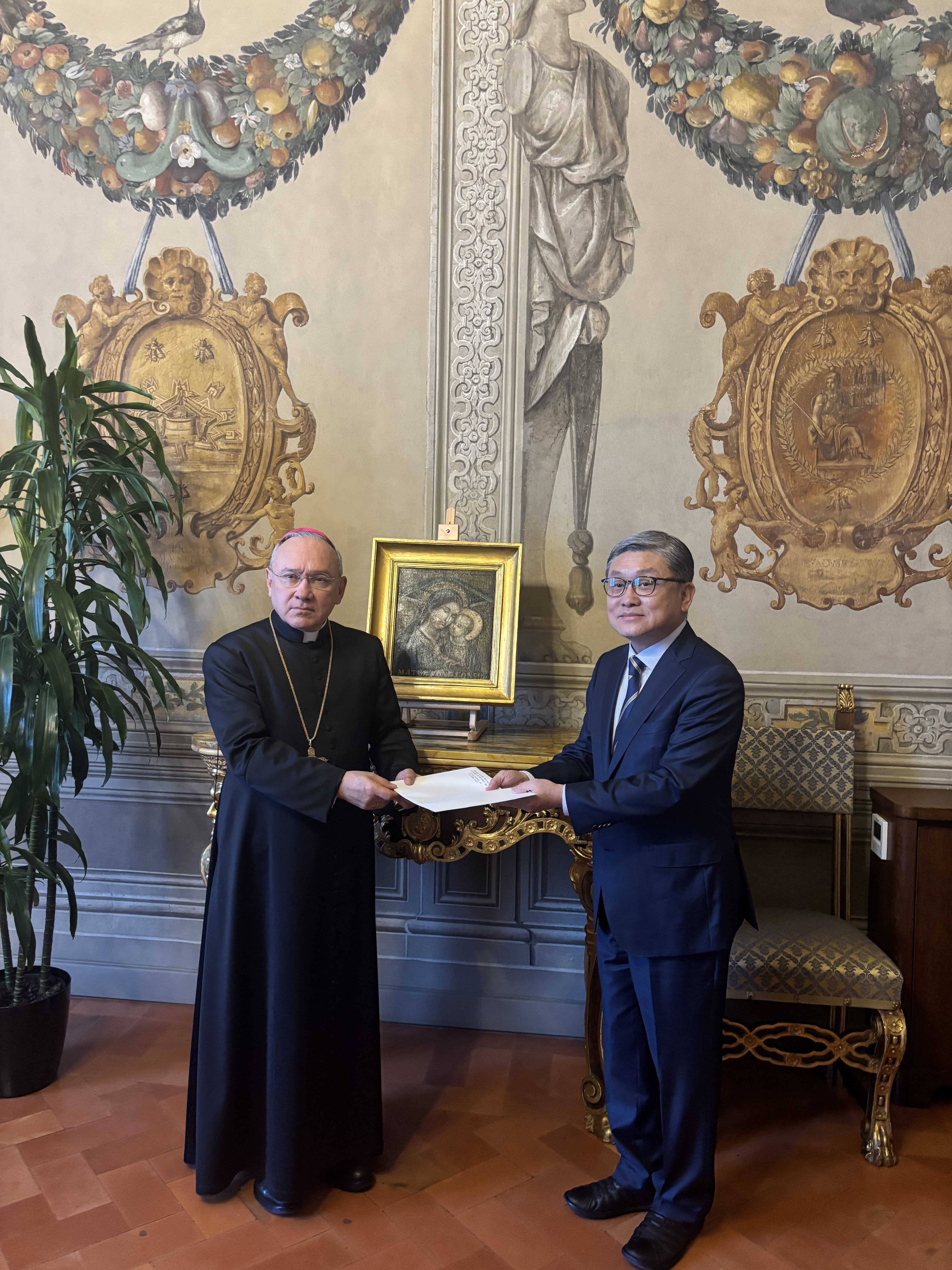 신 대사는 19일(현지시각) 교황청 국무장관 에드가르 페냐 파라 대주교를 예방하고 신임장 사본을 제출했다.