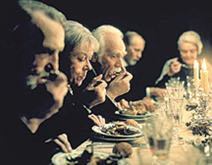 또한 영화는 마을 사람들의 정신적 지주였던 목사이자 자매의 아버지 탄생 100주년이 되는 생일에 특별한 만찬이 차려지는 것에 시선을 집중시킨다. 이 만찬에서 마을 사람들은 각자 과거 불우하고 어려웠던 시기에 그들에게 다가와 성심성의껏 도와주고 영적으로 하느님께 이끌어준 목사에게 감사하면서 목사의 가르침에 대해 이야기한다(기억을 복원시키는 기념제의).