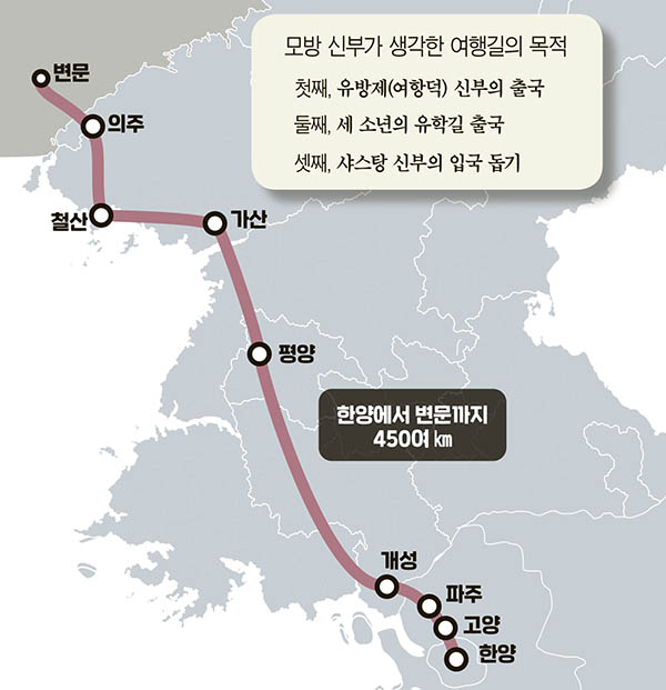 우여곡절 끝에 김대건, 최양업, 최방제 세 신학생과 유방제 신부, 정하상, 조신철, 이광렬, 현석문 등 10여 명은 1836년 12월 초, 중순께 중국 땅 변문을 향해 한양에서 출발했다. 영하 10~30℃의 혹한 속에 한양에서 중국 변문까지 450여㎞를 걸어가는 긴 여정이었다.