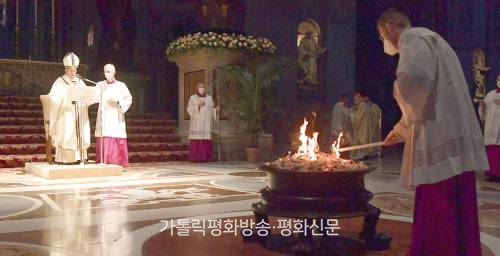 | ▲ 프란치스코 교황이 파스카 성야 미사를 주례하면서 불과 부활초를 축복하고 있다. 【CNS】 |