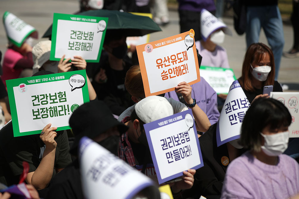 낙태찬성단체 등이 2022년 4월 10일 서울 종로구 보신각 앞에서 집회를 열고, 낙태약 즉각 도입·낙태 시술에 대한 건강보험 적용·재생산 및 성에 관한 건강과 권리 포괄적 보장 등을 촉구하고 있다. 뉴시스