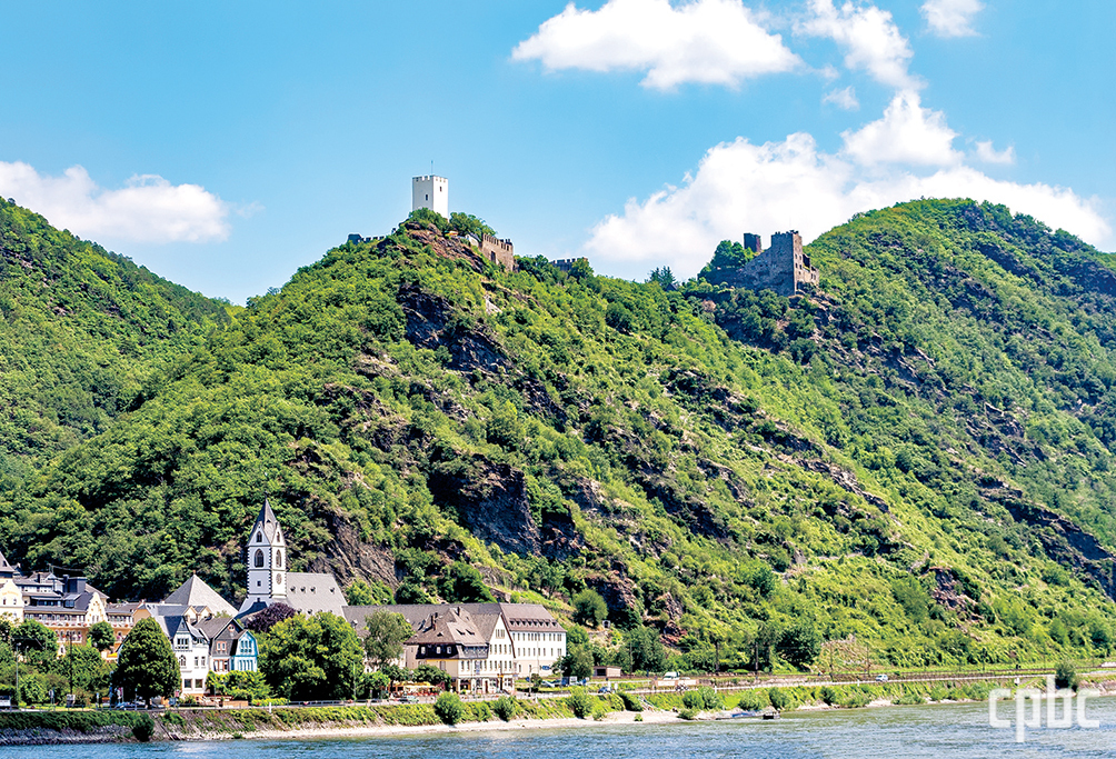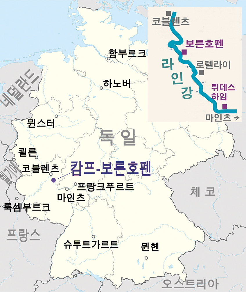 라인강변의 보른호펜 프란치스코회 수도원(왼쪽 아래), '원수가 된 형제'인 슈테렌베르크성(가운데 위)과 리벤슈타인성(오른쪽 아래). 전설에는 형제가 서로 원수가 되어 각각 성을 짓고 반목했다고 하는데, 실제로 두 성의 무력 충돌이 있었던 적은 없다. 현재 호텔과 카페, 문화공간으로 운영된다.