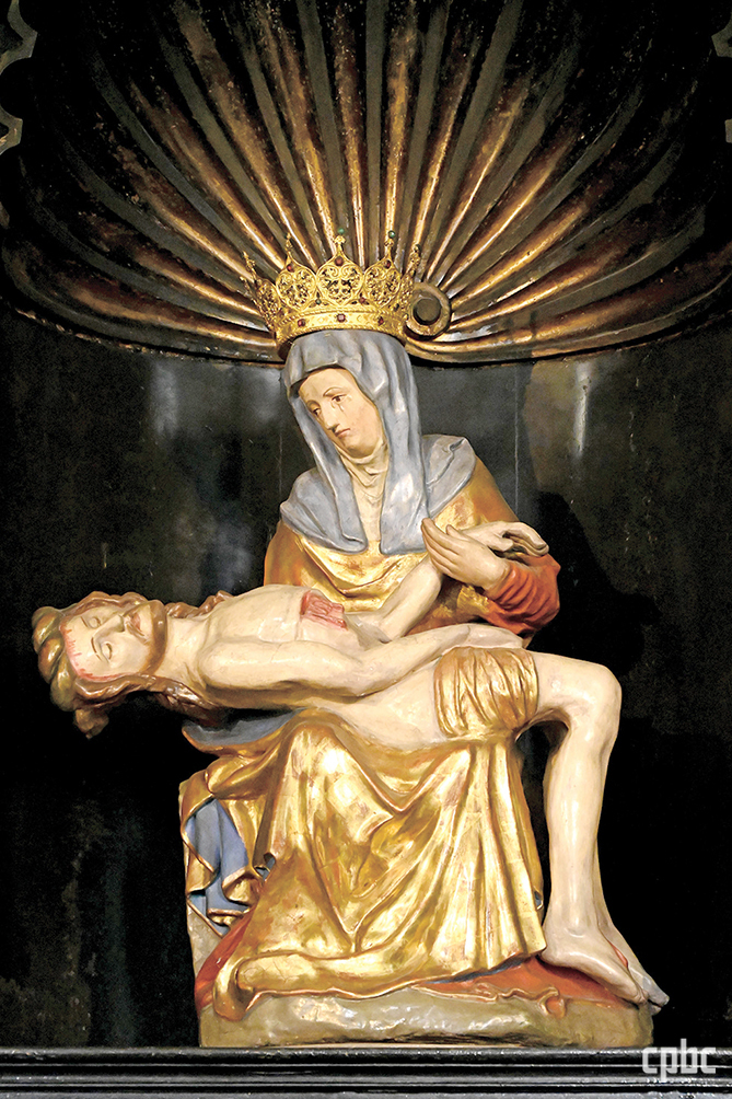 성당 안은 소박합니다. 주 제대의 제단화는 성모 승천을 주제로 한 그림에 바로크 양식의 기둥으로만 장식되어 있을 뿐 별다른 화려함은 보이지 않습니다. ‘보른호펜 피에타’가 모셔진 왼편 소성당 주 제대도 마찬가지입니다. 성모님 무릎 위에 예수님의 몸이 수평에 가깝게 눕혀져 있습니다. 사선 형태로 인체와 감정 묘사가 자연스러운 미켈란젤로의 피에타와는 전혀 다른 느낌입니다. 이런 수평형 피에타는 신자들이 정면에서 그리스도의 시신 전체를 한눈에 바라볼 수 있도록 한 것으로 미사 전례 중 죽음의 무게를 묵상케 합니다. 반면 성모님의 자세는 안정감 있게 처리되어 교회의 어머니이자 수많은 전구로 구원의 은혜를 중개하는 성모의 정체성을 드러내지요.