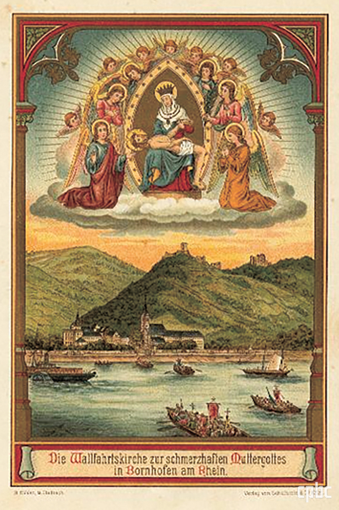라인강 선박 순례 모습을 담은 보른호펜 순례 기념 상본(1885). 매년 5월 1일 순례 시즌 개막 미사로 시작해 동정 성모 마리아 탄생 대축일 등 주요 성모 축일에 큰 행사가 열린다.