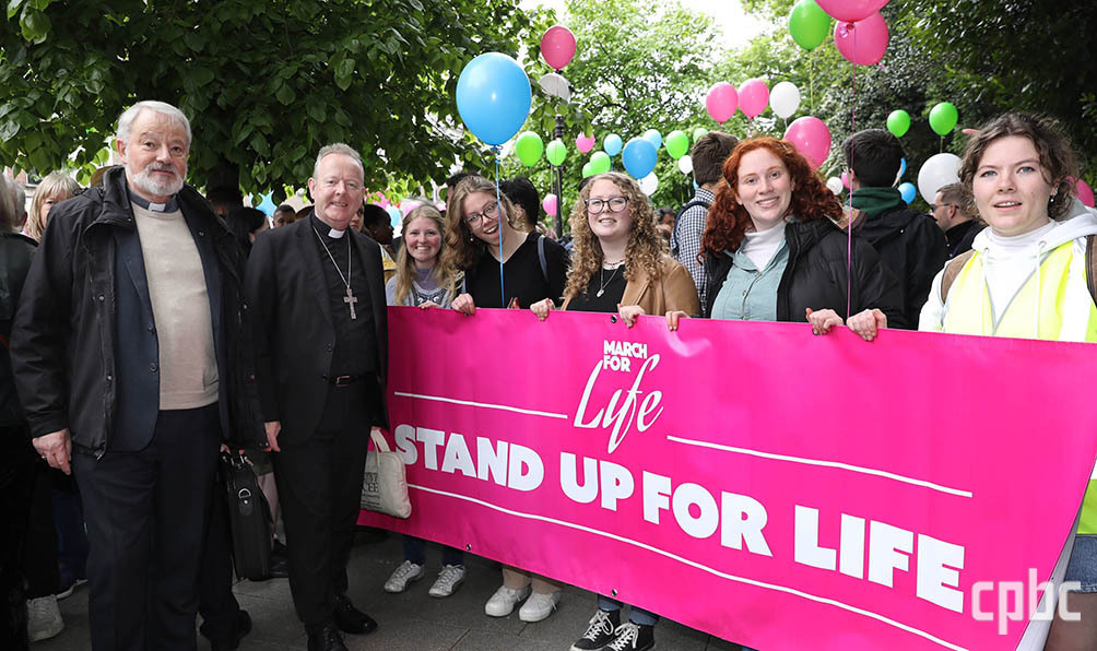 2024년 5월 6일 아일랜드 더블린에서 열린 ‘생명을 위한 행진(March for Life)’ 집회에 참여한 일부 참가자들과 함께 아일랜드 주교회의 생명위원회 위원장 케빈 도란 주교(왼쪽)와 아일랜드 주교회의 의장 에몬 마틴 대주교가 낙태 합법화 반대 시위를 하고 기념촬영을 하고 있다. OSV