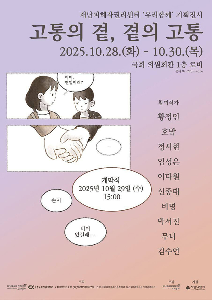 10.29 이태원참사 3주기를 맞아 이태원참사 유가족들을 비롯한 참사 피해자들의 삶과 고통에 대한 증언을 담은 웹툰·일러스트 전시가 국회 의원회관에서 열린다. 재난피해자권리센터 '우리함께'는 해당 전시 개막식이 29일 오후 3시 서울 여의도 국회 의원회관 1층 로비에서 개최된다며 이같이 밝혔다. 개막식에는 송해진 10.29 이태원참사 유가족협의회 운영위원장, 황옥철 재난참사 피해자연대 사무처장, 박주민·용혜인·한창민·김선민 의원 등이 자리한다.