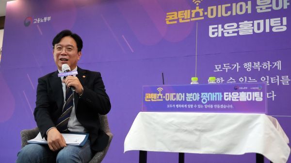 김영훈 고용노동부 장관이 10월 22일 서울 마포구 서울미디어노동자쉼터에서 열린 컨텐츠·미디어 분야 종사자 타운홀 미팅에 참석해 발언하고 있다. 고용노동부