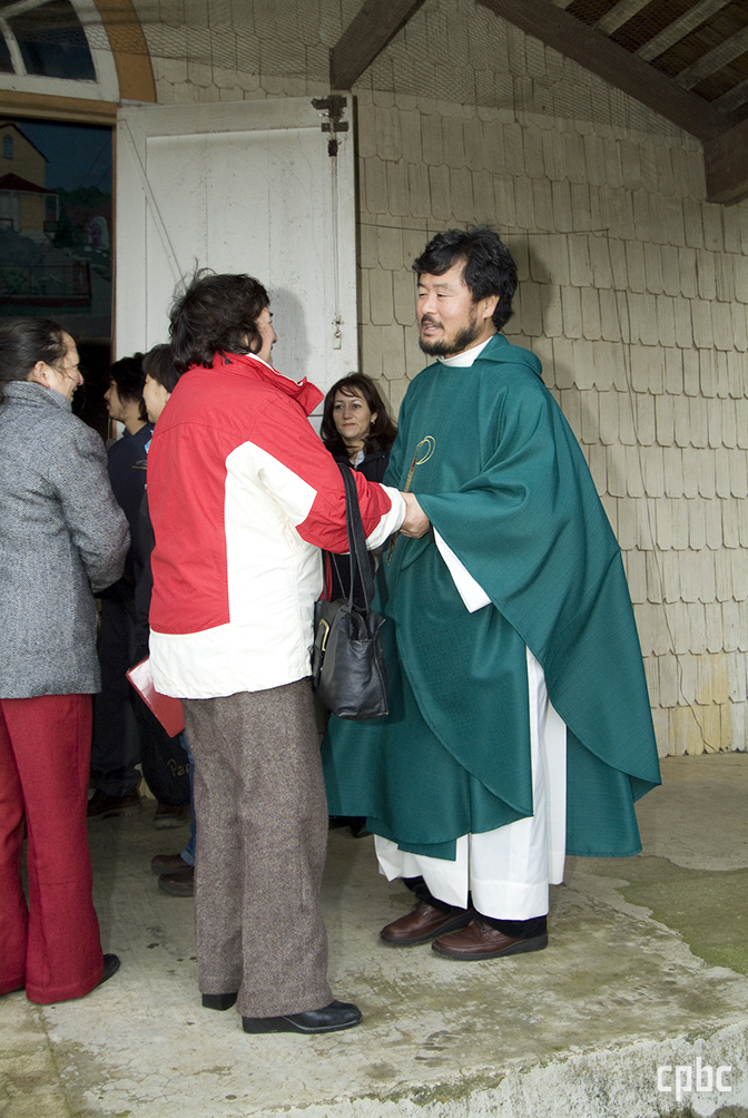 2008년 칠레 남부 리아츄엘로 본당 주임 시절, 미사에 온 신자와 인사를 나누고 있는 김종근 신부.