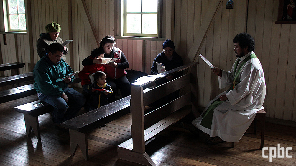 김종근 신부가 2012년 칠레 남부 마푸체 지역 오소르노교구의 한 공소에서 신자들과 기도를 바치고 있다. 전기와 수도가 없어 창문으로 들어오는 빛에 의지해서 기도문을 봐야했다. 성골롬반외방선교회 제공