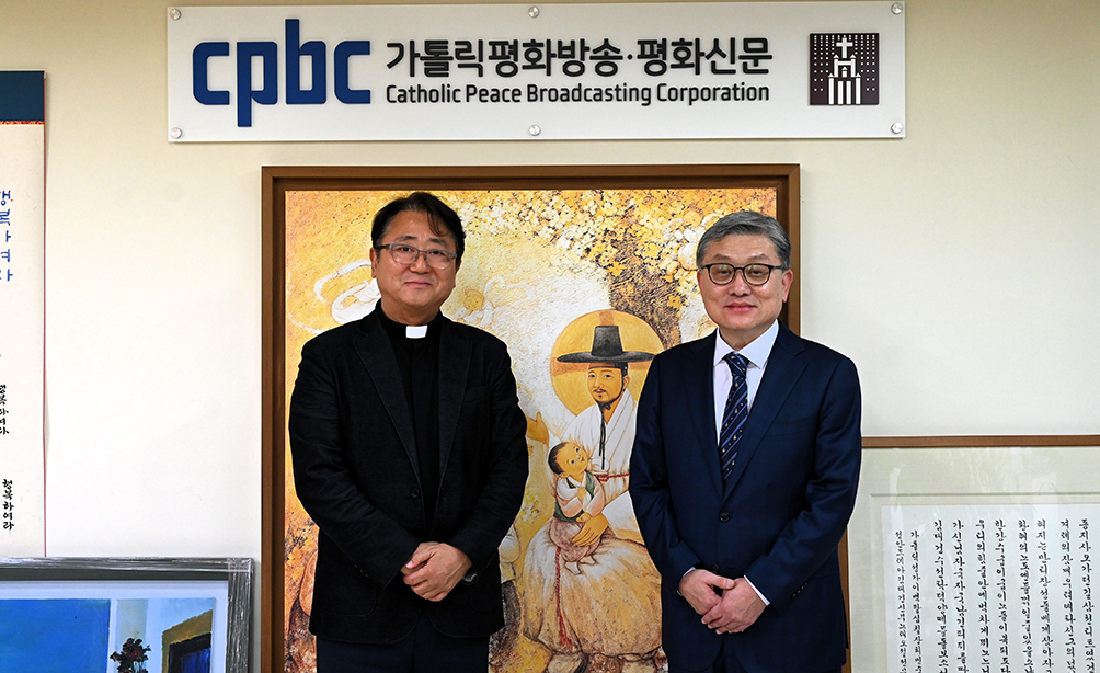 신형식 신임 주교황청 한국대사가 4일 서울 중구 CPBC 본사에서 CPBC 사장 조정래 신부와 기념촬영을 하고 있다.