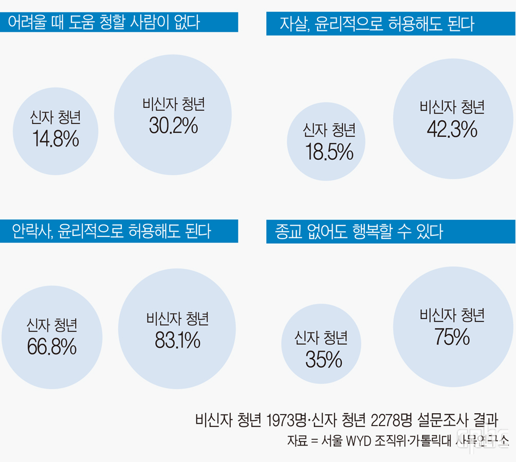 신자 청년이어도 가톨릭 교리를 받아들이긴 하지만 생명과 혼인, 사형제에 관해 교회 가르침과는 다른 경향을 보였다. 자살 문제와 관련해 일반 청년은 42.3가 윤리적으로 허용해도 된다고 답했지만, 신자 청년은 18.5에 불과했다. 하지만 ‘안락사를 윤리적으로 허용해도 되느냐’는 질문에는 일반 청년 83.1, 신자 청년도 66.8가 허용해도 된다는 입장을 보여, 두 집단 모두 생명에 대해 자기 결정권적 모습을 보였다. 사형제가 비윤리적이냐는 질문에도 일반 청년 69.3, 신자 청년 62.3가 동의하지 않았다.