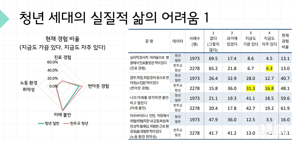 특히 청년의 불안은 신자 청년과 일반 청년을 가리지 않았다. 신자 청년 중 61.9, 일반 청년 59.6가 ‘미래 불안’을 겪는다고 응답했다. 경제적 상황으로 인한 스트레스는 일반 청년 66.8, 신자 청년 58.6에 달했다. 더 좋은 스펙을 위해 노력해야 한다는 응답도 일반 청년 58.5, 신자 청년 62.5를 기록해 과반의 청년이 공통된 불안 속에 살아가는 것으로 나타났다.