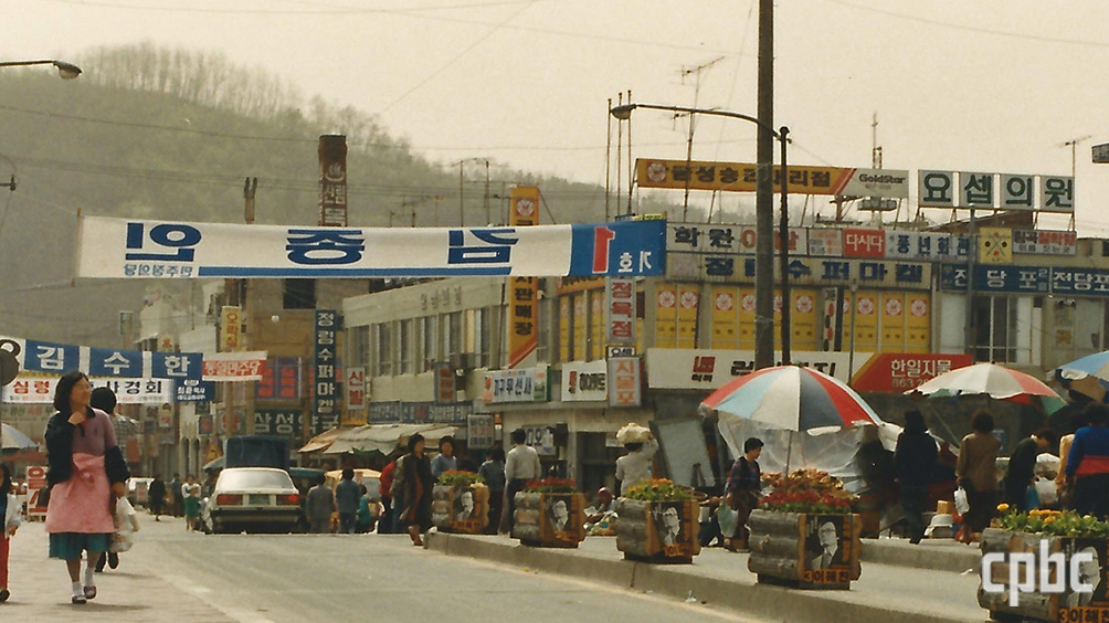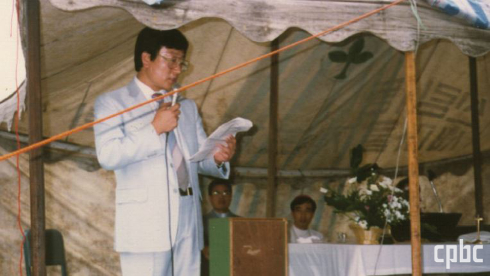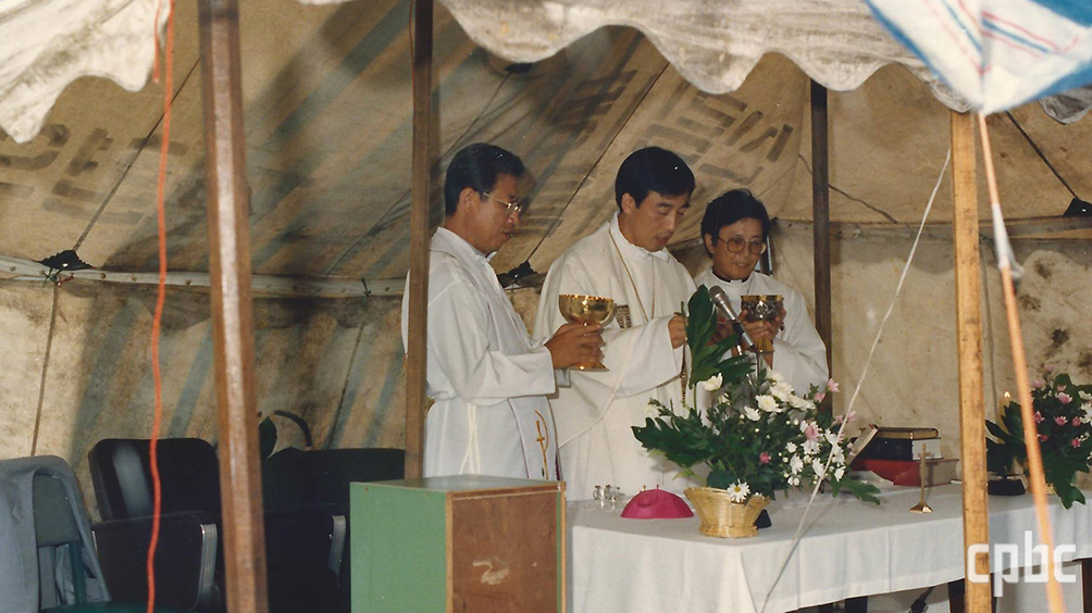 1987년 8월 29일 신림사거리 관악종합시장 옥상에서 서울가톨릭사회복지회를 담당하는 강우일 주교가 요셉의원 개원 미사를 주례하고 있다.
