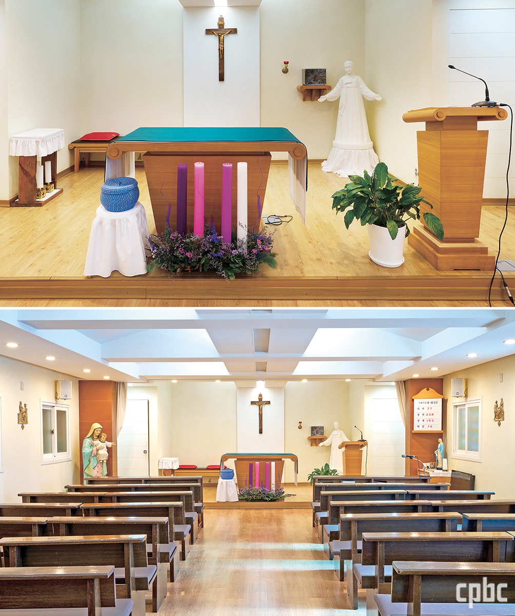 후리사공소 제단. 제대와 나무 십자가, 감실과 한복 입은 성모상이 소박하게 꾸며져 있다.