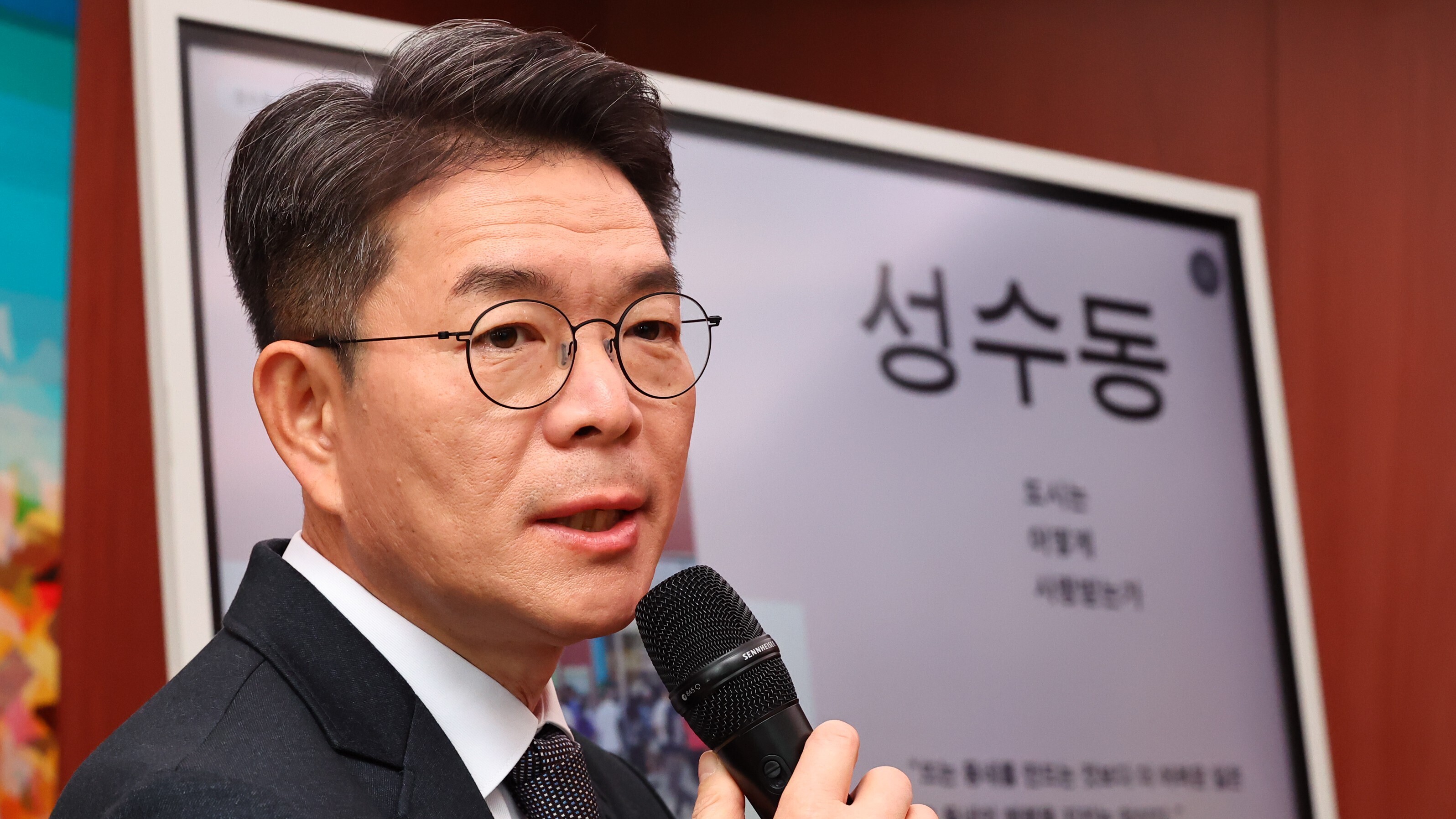 정원오 성동구청장이 10일 서울 성동구 펍지성수 라운지에서 성수동 책 관련 기자간담회를 하며 기자들의 질문에 답하고 있다. 뉴시스