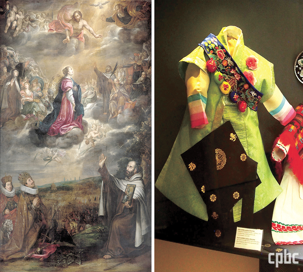 안토닌 스테벤스가 그린 주 제대의 제대화(1641)와 프라하의 아기 예수 박물관에 전시된 한복(2011). 박물관에는 베네딕토 16세 교황이 봉헌한 관을 비롯해 마리아 테레지아 황후가 봉헌한 예복, 한국·필리핀·이탈리아·폴란드 등에서 봉헌한 전통 예복 등 총 100벌의 예복과 전 세계 크리스마스 구유 세트가 전시되어 있다.