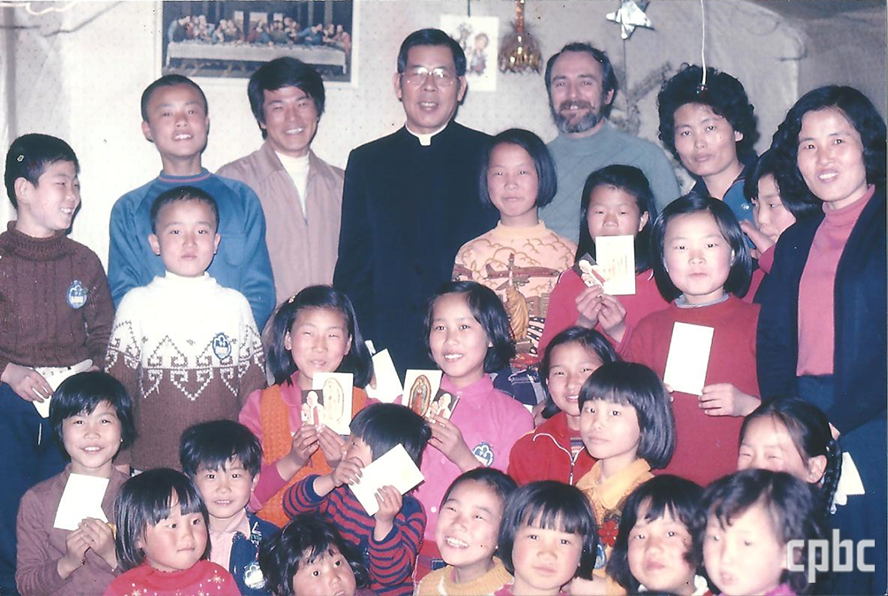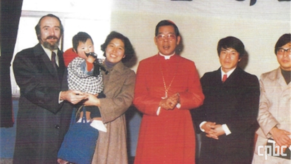 김수환 추기경과 제정구(가운데 오른쪽) 첫 딸 아름을 낳은 후에 부인 신명자(가운데 왼쪽)씨, 정일우(왼쪽 맨 끝) 신부.