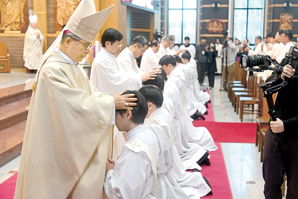 사제 성소 감소는 한국 교회의 과제로 떠올랐다. 2025년 12월 5일 수원교구 사제서품식에서 이용훈 주교와 교구 사제단이 새 사제들에게 안수하고 있다. 수원교구 제공