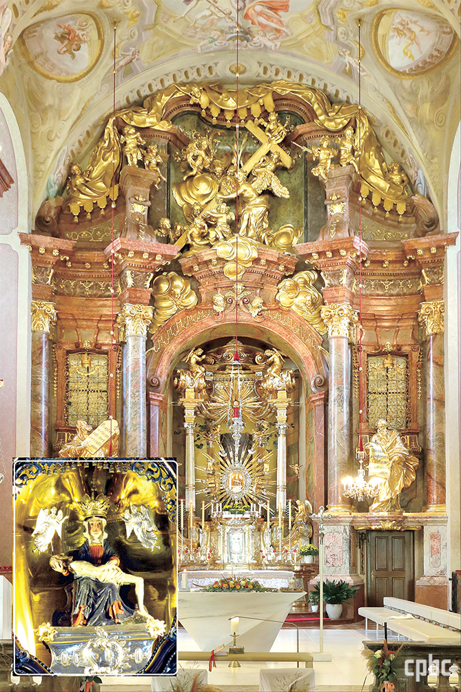 마리아 타펄 바실리카의 주 제대와 은총의 피에타상. 성모 신심의 중심이 된 은총의 피에타를 모신 참나무 자리에 주 제대를 조성했다. 성당의 주 제대가 동쪽이 아니라 북쪽에 자리한 것도 이 때문일 수 있다. 1734년 파사우 출신의 조각가 요제프 마티아스 괴츠가 설계했으며, 린츠의 건축가 요한 미하엘 프룬너와 금세공인 요한 페터 슈벤터의 참여로 1739년에 완성되었다.