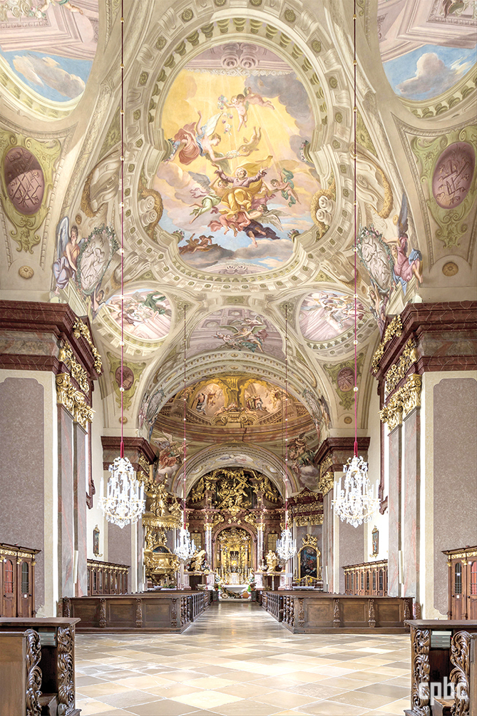 단일 신랑의 짧은 교차랑 구조인 마리아 타펄 바실리카. 1713~1718년 기존의 석고 장식을 걷어 내고, 안토니오 베두치의 밑그림대로 벽면과 천장을 하나의 천상 무대로 구현했다. 교차랑 위의 돔 천장에는 성모 승천과 성모의 삶, 신랑의 천장에는 성 요셉의 영광이 묘사되어 있다.