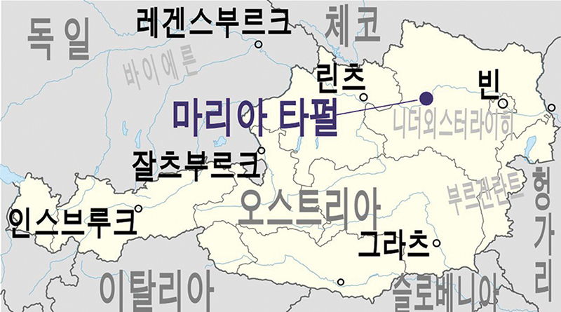 마리아 타펄 바실리카는 오스트리아 니더외스터라이히주, 도나우 계곡의 능선에 자리하고 있습니다. 빈에서 서쪽으로 한 시간 거리로 멜크 수도원과도 지척이라 좋은 하루 순례 코스입니다. 도나우 강변도로를 따라가다 보면, 강이 단순한 풍경이 아니라 길이었다는 사실을 깨닫습니다. 중세 산티아고 순례길과 예루살렘 순례길이 여기서 잠시 겹칩니다. 순례자들은 레겐스부르크·빈에서 강을 따라 마르바흐 마을까지 와 이곳 언덕에서 잠시 머물렀을 테지요.