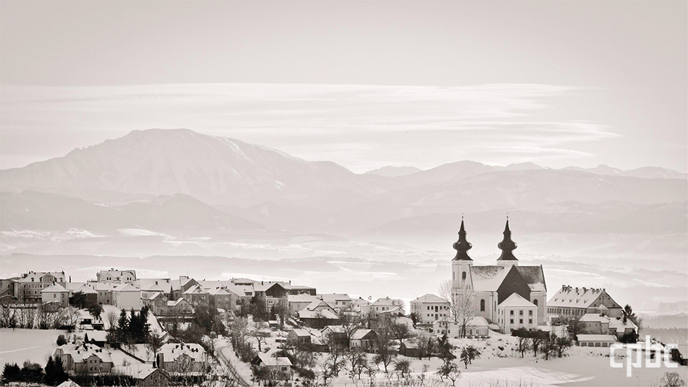눈 덮인 마리아 타펄 바실리카. 해발 450m(강 기준 233m) 니벨룽겐가우 언덕에 자리하고 있어서 성당 마당에서 도나우강 너머 넓은 구릉지대가 한눈에 들어온다. 강을 따라 서쪽으로 시선을 돌리면 멜크 수도원이 어렴풋이 보인다.