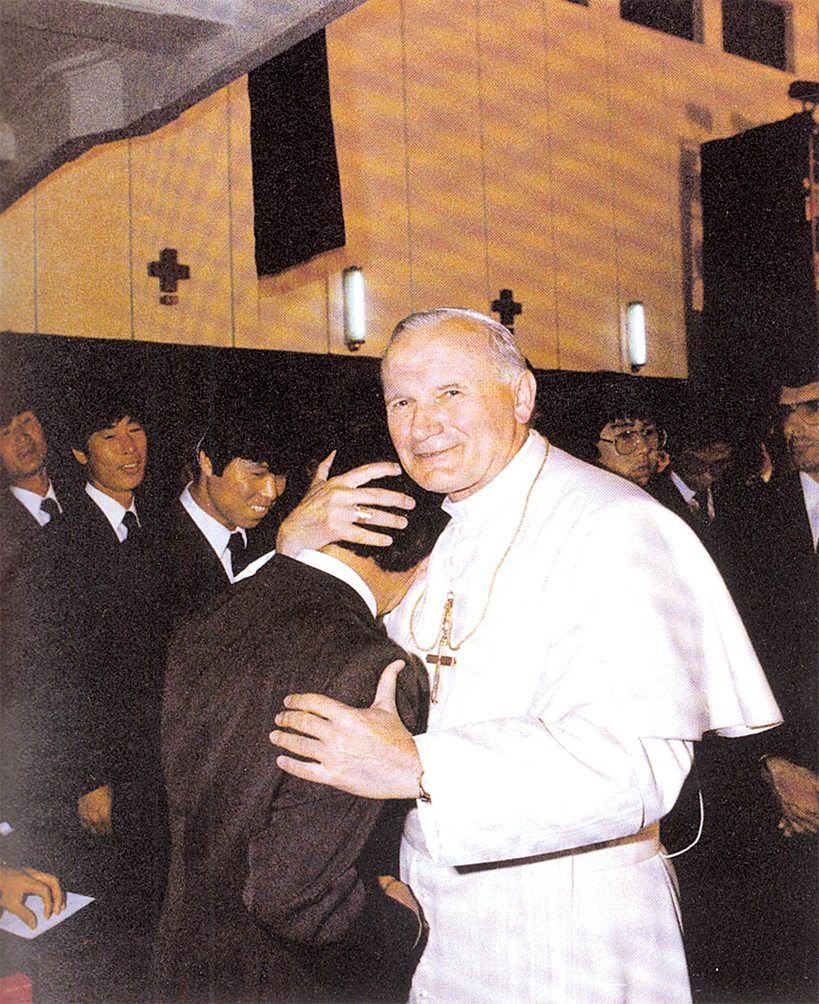 대신학교 대성당에서 방한 첫 미사를 주례한 성 요한 바오로 2세 교황이 신학생을 안아주며 격려하고 있다. 서울대교구 대신학교 제공