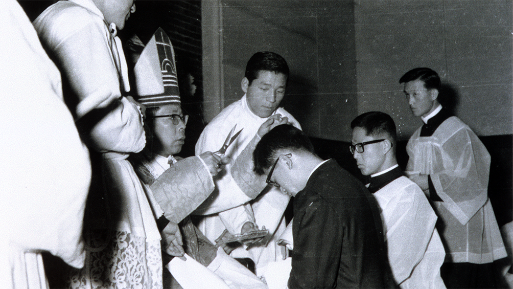 1968년 김수환 추기경(당시 대주교)이 신학생들의 삭발례 예식 중 가위로 머리카락을 깎아주고 있다. 서울대교구 대신학교 제공