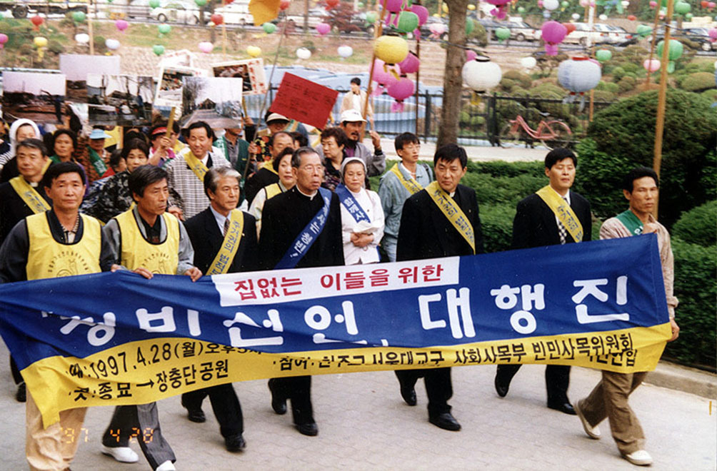 1997년 서울대교구 빈민사목위원회의 청빈선언에 참석한 김수환 추기경(앞줄 왼쪽 네번째)과 제정구 의원.