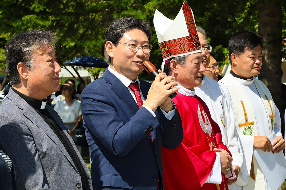 이상일(왼쪽 두 번째) 시장이 2025년 9월 11일 용인시 처인구 ‘청년김대건길’ 명예도로 현판식에서 기념사를 하고 있다. 이 자리에는 수원교구 총대리 문희종(왼쪽 세 번째) 주교를 비롯한 교구 사제단과 신자, 시민들이 함께했다. 용인특례시 제공