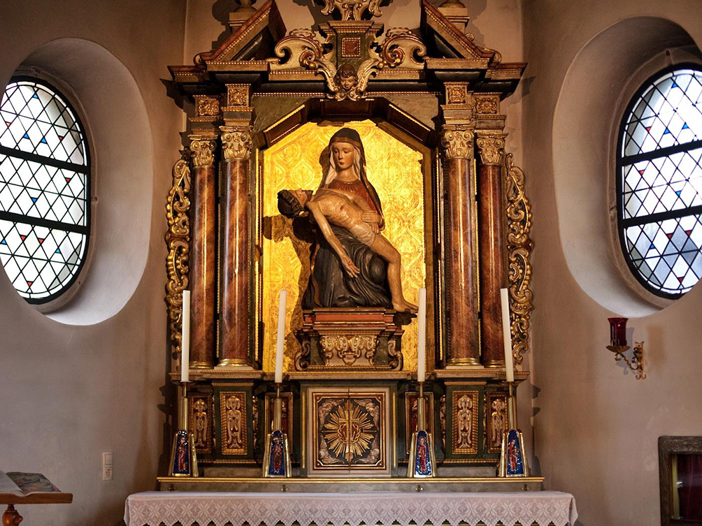 소성당은 30명 남짓 앉을 수 있는 작은 공간입니다. 제대 쪽 끝은 완전히 반원형이 아니라 팔각형의 8면 가운데 3면을 이어붙인 형태입니다. 직선으로 꺾인 벽면으로 시선이 제대에 집중되는데, 중세·근세 교회 건축에서 자주 쓰인 형태입니다. 베텐의 피에타상은 고통을 과장하기보다 자애로운 표정이 인상적입니다.