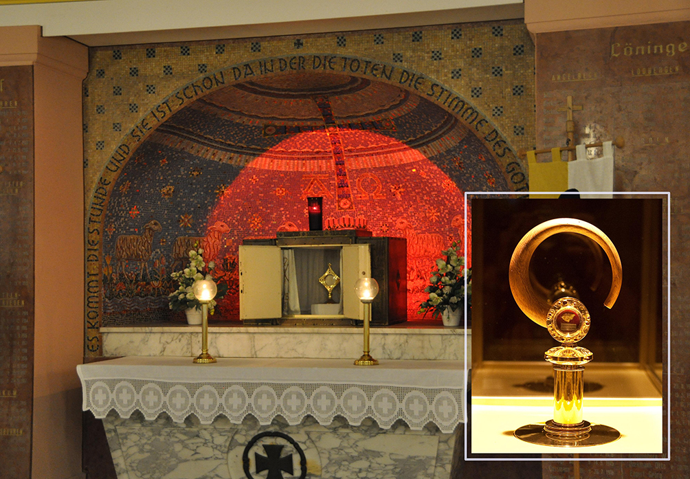 순례 성당의 지하 소성당과 복자 클레멘스 아우구스트 폰 갈렌 성유물함(박스). 전쟁 희생자들을 기억하는 공간으로 제2차 세계대전으로 사망·실종된 올덴부르크 지역 본당 신자들의 이름이 기록되어 있다. 주교 지팡이 모양의 성유물함에는 추기경의 축복을 뜻하는 오른손 성해 일부가 모셔져 있고, “칭찬에도, 두려움에도 흔들리지 않고”란 사목 표어가 쓰여있다.