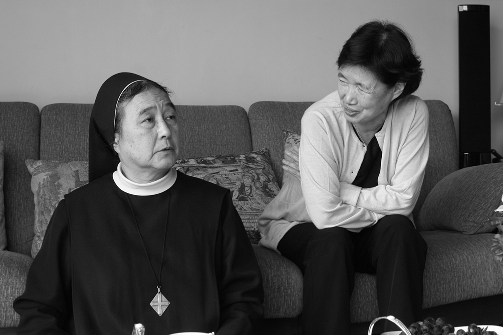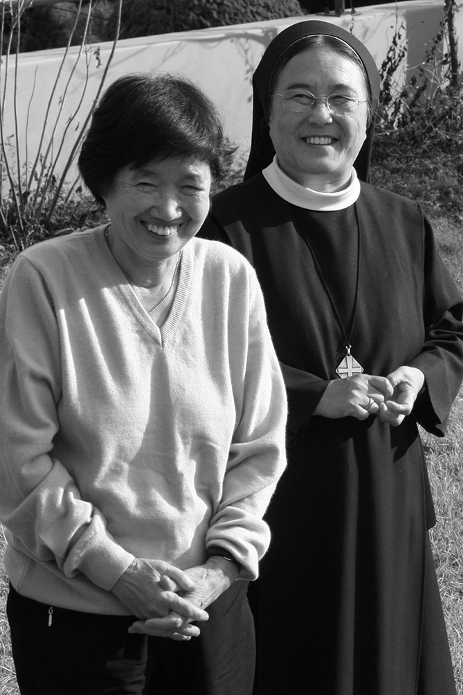이해인 클라우디아 수녀와 함께 자택에서. 두 사람은 1988년 박완서 작가가 가족을 연이어 잃고 슬픔에 빠져있을 때 친분을 쌓아 더 가깝게 지냈다. 14살의 나이 차에도 자매처럼 서로의 아픔을 보듬으며 위로와 정을 나누었다. 한영희 작가