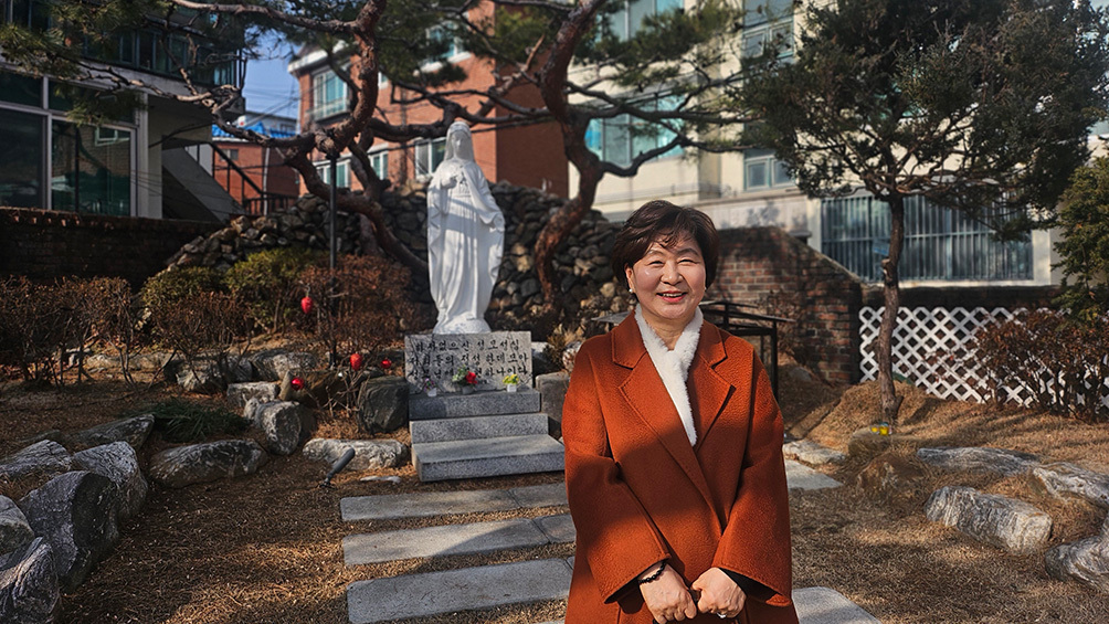 의정부교구 첫 여성 평협회장 조정실씨가 교구청 앞마당에서 환하게 웃고 있다.