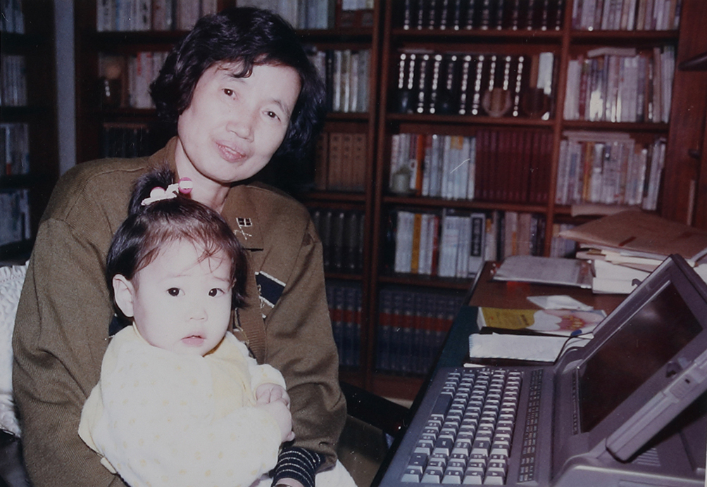 1990년 손주와 함께 집에서. 1989년 아들 원태가 살아있을 때 사놓고 사용하기를 권했던 워드프로세서로 다시 글을 쓰기 시작해 역사소설 「미망」을 집필했다. 박완서 작가는 컴퓨터로 글을 쓰는 작가가 많지 않았던 때부터 죽음을 앞둔 순간까지 컴퓨터로 쓰고 저장하는 작업을 했다. 1950년대에 이미 원두커피를 즐겼고 오븐이 없던 시절에도 집에서 빵을 굽고 별식으로 멘보샤를 만들 정도로 감각적인 ‘얼리어답터’였다고 맏딸 호원숙(비아)은 어머니를 기억한다. 박완서디지털문학관 제공