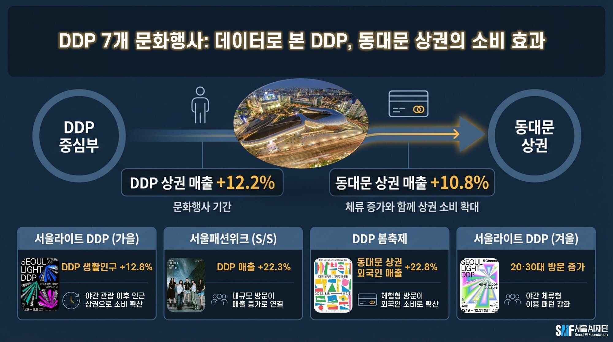 DDP 봄축제 기간엔 외국인 소비가 늘어난 것으로 집계됐다. 외국인 매출이 DDP 인근 평균 21.7, 동대문 상권에서 평균 22.8 증가한 것으로 나타났다. 또 2~30대 청년층은 서울라이트 DDP(겨울)가 진행될 때 방문이 늘었다.
