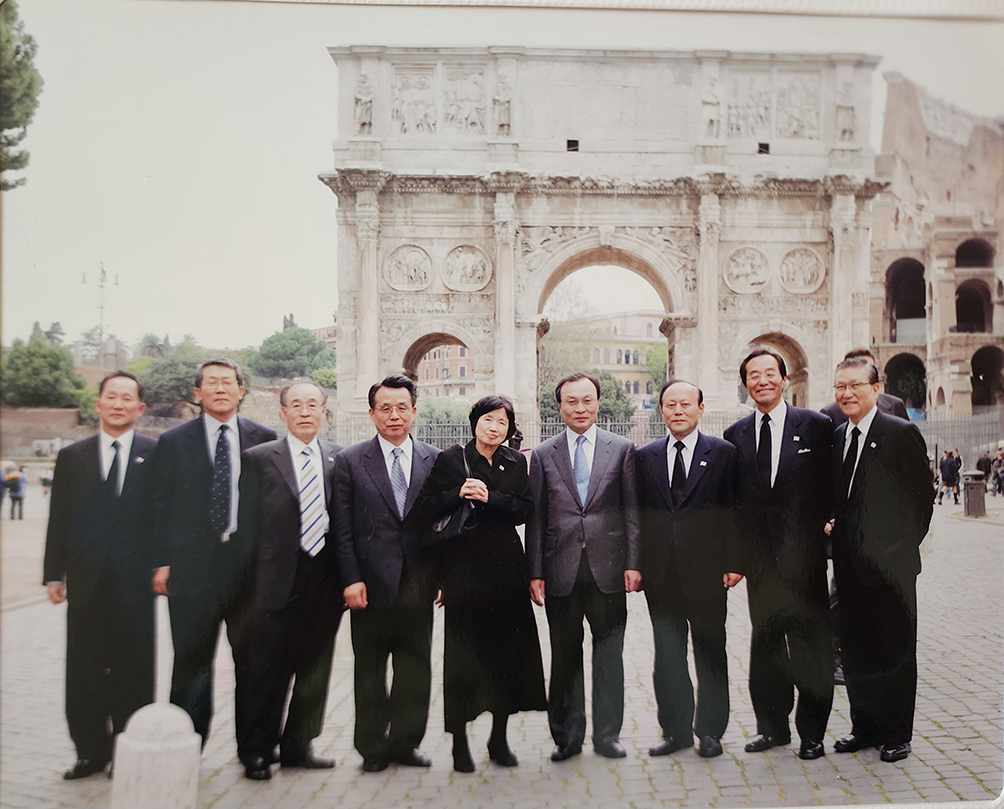 2005년 4월 8일 바티칸에서 거행된 요한 바오로 2세 교황의 장례미사에 참석한 후 로마에서. 박완서 작가(가운데) 왼쪽이 한승수 전 국무총리, 오른쪽이 고 이해찬 전 국무총리다. 오른쪽 두 번째에 봉두완 전 앵커도 보인다. 박완서디지털문학관 제공