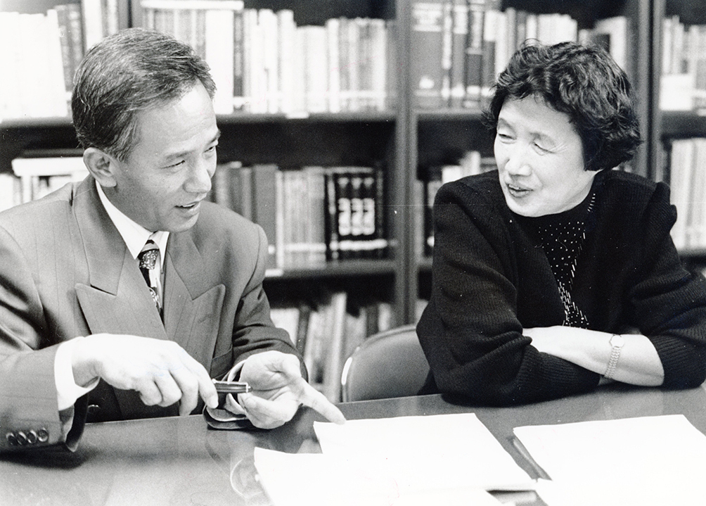 박완서·김홍신 작가가 1993년 12월 27일 본지가 주최한 제1회 신춘평화문학상 응모작을 심사하며 대화하고 있다. 가톨릭평화신문 DB