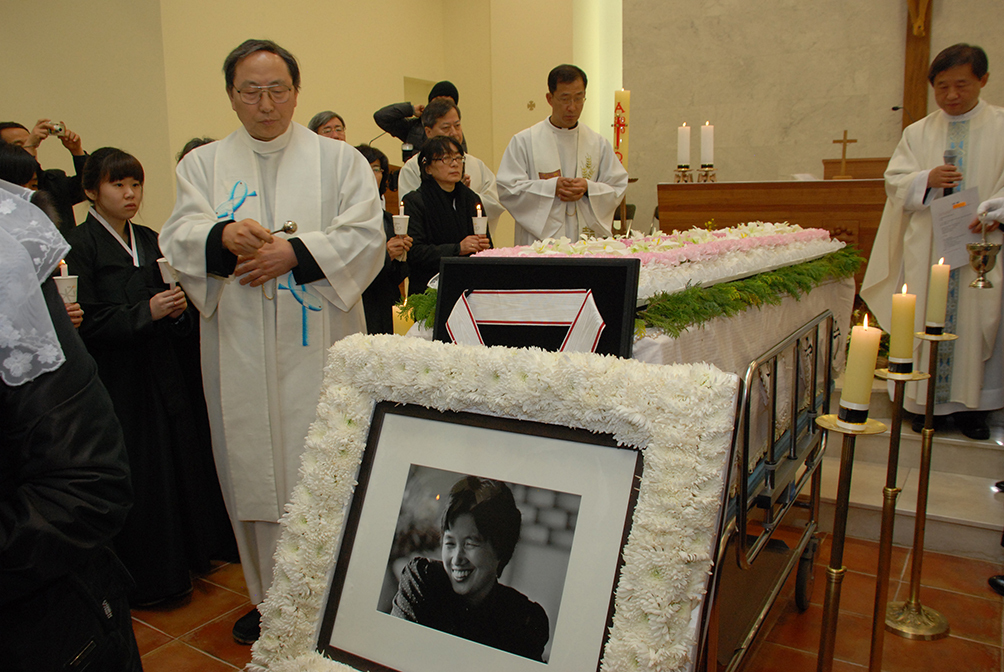 2011년 1월 22일 선종한 박완서 작가. 한국가톨릭문인회 담당 조광호 신부가 장례미사에서 고인의 관에 성수를 뿌리며 고별예식을 주례하고 있다. 가톨릭평화신문 DB