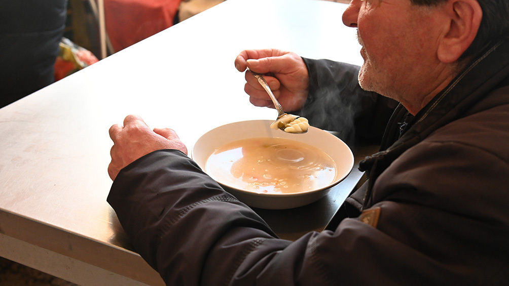 폴란드 크라쿠프대교구 카리타스가 운영하는 무료 급식소 ‘성 알베르토의 부엌’에서 한 이용자가 수프를 먹고 있다.