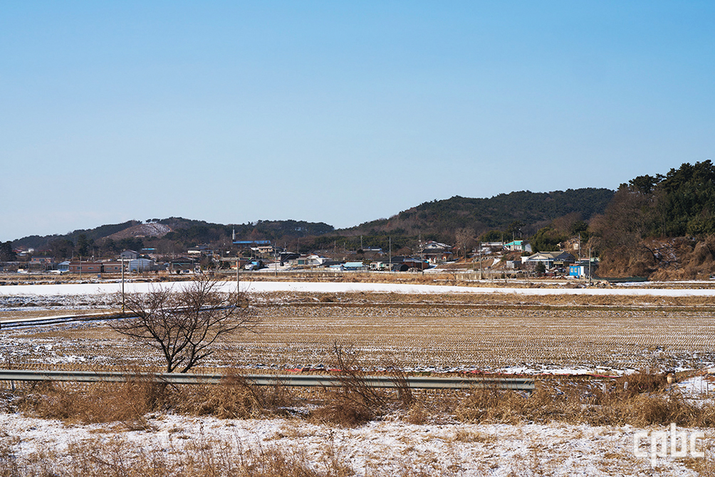 은포리공소는 앞에 농지가 조성돼 있고 그 너머로 마을과 야트막한 산들이 감싸고 있다.